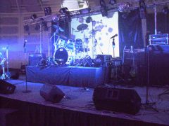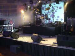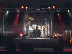 2 x4 blinders dmx à led , un poursuite en HMI 575 , un laser progammé par P.C. , d'une nouvelle commande ligth , d'une machine à brouillard le tout monté sur un pont en eurotreuss (structure au carré) sur pied élévateur à niveau pouvant monter jusqu'à 7 metre de hauteur ...